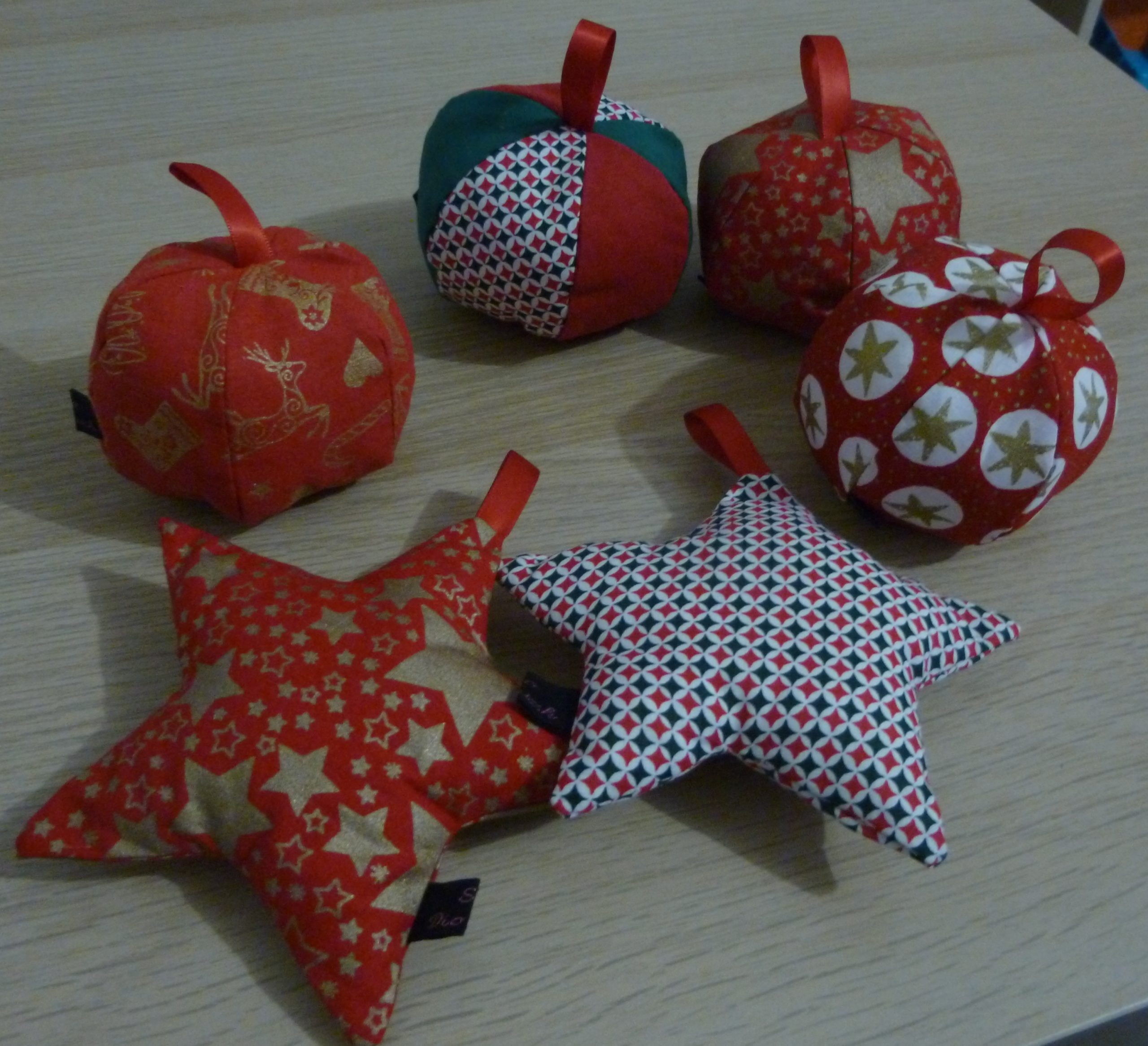 Je vous propose des suspensions en forme de boule et d’étoiles ainsi que des guirlande fanion. Le tout cousu avec délicatesse mais surtout avec des tissus de Noël.